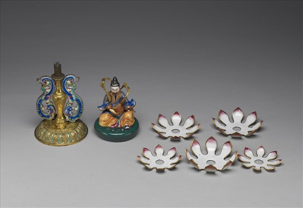 銅胎畫琺瑯,一財臣半跏坐於蓮蓬上,下襯蓮花托,插有蓮花托的蕉葉紋瓶立於莨苕葉紋座上,兩側飾有一對琺瑯彩夔龍裝飾。財臣也稱文臣,為七政寶中掌管國家財政的主藏臣寶,七政寶是輪轉王治國之寶,也稱為七珍,中琺1298-1304為一組完整的七政寶。