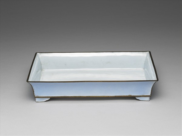 銅胎方形花盆,上層撇口,深壁,四角有L型如意雲形足。外壁天藍色,內壁為白色琺瑯釉,器緣露胎鍍金。底有「大清乾隆年製」三行六字篆書款。