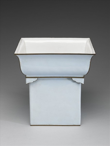 銅胎方形花盆,上層撇口,深弧壁,四角有L型如意雲形足,底部挖空,與下段長直方筒相連。外壁施淺藍色琺瑯釉,內壁及內外底施白色琺瑯釉,全器器緣皆露胎,有使用痕。外底中央以青花書「大清乾隆年製」六字三行篆款。