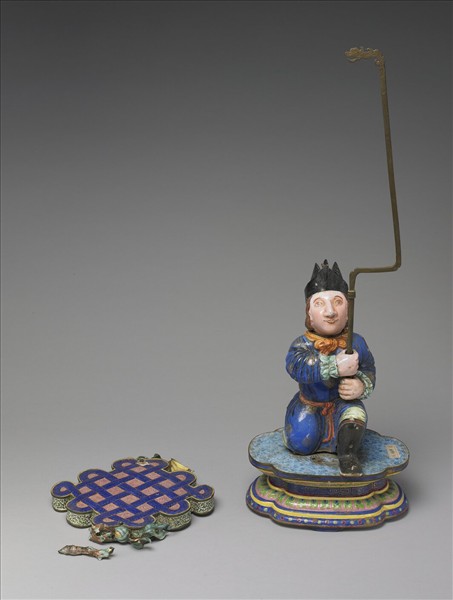 銅胎畫琺瑯西洋人物像,人物蹲跪於一四瓣花式座上,頭微微上揚,雙手抓握懸掛八寶中盤長之長杆。此人物戴黑帽,棕髮鬈曲柔軟,高鼻大眼且目光炯炯有神。其頸繫橘巾,身穿深藍色印有金色團花卉之袍服,並紥紅色腰帶。袍服底下為淺綠色褲管,足蹬黑色高筒靴。藍色盤長上有金色鱗狀線紋,底襯粉紅地金色卷草紋錦地,側邊飾淺綠地金色卷草紋邊飾。人物下方之底座中段窄而上下段寬,表面帶淺藍地花葉紋,側邊中央為藍地回紋,上、下端依序飾蓮瓣紋與黃、藍弦紋。白色座底帶四個長方板形足,中央栓有方形鐵片,座身疑似中空。