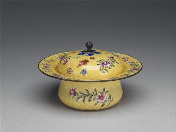銅胎,敞口,兩層折沿、垂腹,戴寶珠鈕圓頂蓋,內有一淺漏斗。以畫琺瑯為飾,全器黃地,蓋鈕底部繪朵花紋,旁邊圍繞如意雲紋,蓋面與外折沿繪折枝月季、石竹以及天牛、蜻蜓;腹外壁繪有折枝梅花、石竹及菊花。內折沿為漏斗架,器緣露胎處鍍金。