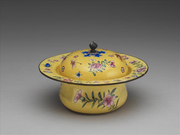 銅胎,敞口,兩層折沿,垂腹,戴寶珠鈕圓頂蓋,內有一淺漏斗。以畫琺瑯為飾,全器黃地,蓋鈕底部繪朵花紋,旁邊圍繞如意雲紋,蓋面與外折沿繪折枝月季、石竹以及天牛、蜻蜓;腹外壁繪有折枝梅花、石竹及菊花。內折沿為漏斗架,器緣露胎處鍍金。