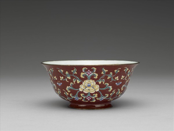 銅胎碗,敞口微撇,深弧壁,圈足外撇,器口沿與足緣銅扣鎏金。器內壁施淺湖綠釉,無紋,外壁以深紅色釉為地,以描黑細線等距繪飾四朵盛開的黃色重瓣花卉與彩色蝴蝶四隻,花蕊呈紫色;花卉兩側則飾以紫色或淺藍色含苞花與綠色葉紋,盛開黃色花朵的兩側紋飾大致對稱,只在含苞花顏色上有所不同。花色素雅,形狀工整富麗。足內白釉地,有藍色字「大清乾隆年製」三行六字篆款。「洋瓷」為清代乾隆朝文獻上用來稱呼畫琺瑯的名稱之一。