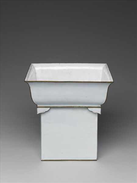銅胎方形花盆,上層撇口,深弧壁,四角有L型如意雲形足,底部挖空,與下段長直方筒相連。外壁施淺藍色琺瑯釉,內壁及內外底施白色琺瑯釉,全器器緣皆露胎。外底中央以青花書「大清乾隆年製」六字三行篆款。
