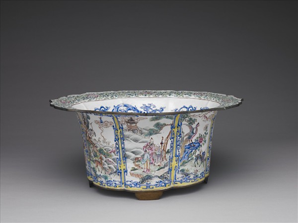 銅胎八瓣花式盆,撇口,深直壁,平底,底部帶三圓孔,帶四板形矮足。器外壁口沿邊緣繪飾一圈不規則塊狀圖紋,腹壁為黃地,並飾八個方形開光,開光邊框為藍色拐子龍紋。八開光為四組圖畫重複繪製而成,一圖飾鳳凰與麒麟,週遭環繞靈芝、牡丹,兩蝙蝠迴旋於天際祥雲間。一圖飾鹿與鶴鳥站立於松柏間,週遭有祥蝠與靈芝,帶有「長青」之吉祥意涵。一圖中三老者齊聚於岸邊松樹下,遠方有一高聳樓閣,一老者長臉高額,手拄拐杖;一老者身穿紅衣,手持如意,從諸多特徵推測可能為福祿壽三星。一圖為仕女與俾女相對望,仕女持盤托有容器,俾女肩負一籃壽桃,推測為麻姑獻壽圖。器內壁口沿處環飾轉枝花葉紋,四蝙蝠穿梭其中。器身內壁為白地,四條藍色回首行龍分布於腹上壁。器外底亦施白釉,中心處飾藍色團龍圖案。