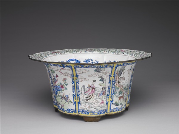 銅胎八瓣花式盆,撇口,深直壁,平底,底部帶三圓孔,帶四板形矮足。器外壁口沿邊緣繪飾一圈不規則塊狀圖紋,腹壁為黃地,並飾八個方形開光,開光邊框為藍色拐子龍紋。八開光為四組圖畫重複繪製而成,一圖飾鳳凰與麒麟,週遭環繞靈芝、牡丹,兩蝙蝠迴旋於天際祥雲間。一圖飾鹿與鶴鳥站立於松柏間,週遭有祥蝠與靈芝,帶有「長青」之吉祥意涵。一圖中三老者齊聚於岸邊松樹下,遠方有一高聳樓閣,一老者長臉高額,手拄拐杖;一老者身穿紅衣,手持如意,從諸多特徵推測可能為福祿壽三星。一圖為仕女與俾女相對望,仕女持盤托有容器,俾女肩負一籃壽桃,推測為麻姑獻壽圖。器內壁口沿處環飾轉枝花葉紋,四蝙蝠穿梭其中。器身內壁為白地,四條藍色回首行龍分布於腹上壁。器外底亦施白釉,中心處飾藍色團龍圖案。