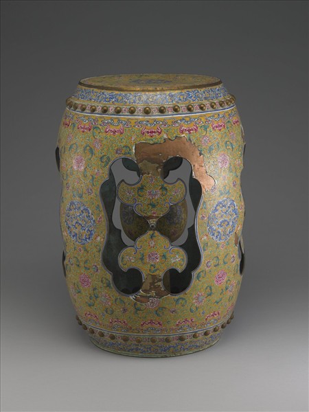 銅胎鼓式墩,外型有如平削兩端的橄欖,但器身較長。外壁上下各凸起乳丁一圈,除此之外,則以多彩釉繪飾繁密的花紋。上頂面滿繪黃地卷草花葉,邊緣繞蝙蝠、雲紋一圈,中心繪藍色團雲狀的類拐子龍紋飾。器外壁等距鏤空如意雲頭紋飾,由鏤空處可見器內有一管軸承,軸承中段帶一圓球,有如軸承之凸棱。器內圓球面繪飾黃地卷枝番蓮花葉。器外壁紋飾的樣式與配置概念與頂面所繪基本類同,亦以團雲狀柺子龍飾為中心,外飾卷枝花葉、蝙蝠、雲紋,只可惜已有剝損。底外露胎,無款識。