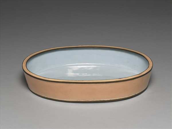 銅胎橢圓形花盆,內摺平口沿,直壁,平底,帶四片壁形矮足。盆外壁施淺橘色釉,器內施淺藍釉,皆光素無紋。器底塗施一層厚重白釉,有「大清乾隆年製」藍料六字三行篆書款。全器釉色均勻,器型樸實端莊。