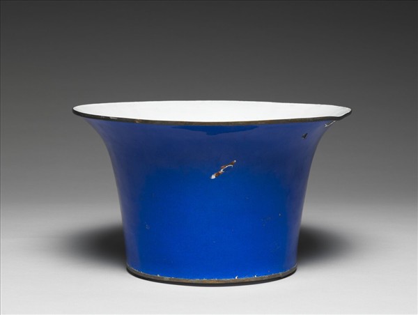 銅胎圓花盆,撇口,深壁,平底,帶三片狀矮足。器外壁施霽青釉至腹底,器內壁與底部施光潤勻亮之白釉,口沿處與腹底露銅胎。全器光素無紋,底有「大清乾隆年製」六字三行藍料篆書款。此器外壁與內壁均有數處損傷,露出底部銅胎底。