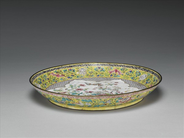 銅胎畫琺瑯黃地開光花卉盤