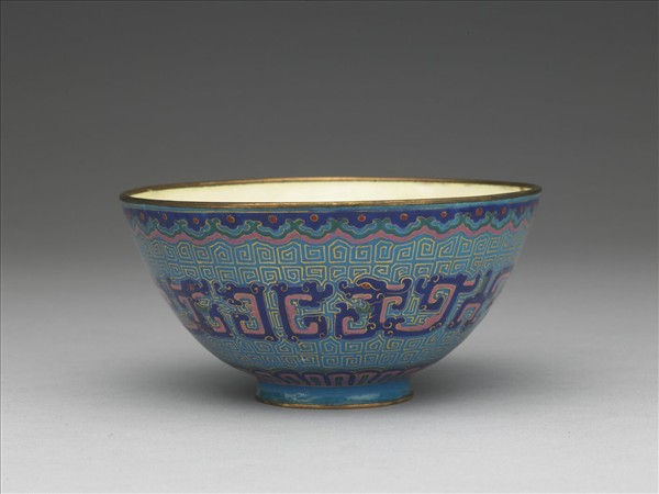 銅胎碗,直口,深弧壁,外撇圈足。器外壁以藍釉為地,並佈滿金色回紋錦。口沿下飾一圈如意雲紋,腹中央繪粉紅與藍色拐子龍紋,腹底有仰蓮瓣紋,各種紋飾皆以金彩描邊。器內與圈足內底施白釉,圈足內中央書一紅色團壽字。此碗顏色繽紛奪目,金、粉紅、綠、藍釉交相輝映。
