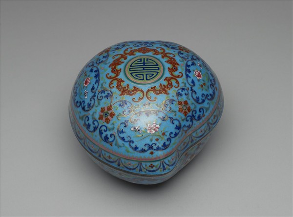 銅胎桃式盒,帶子母蓋。蓋面及盒外壁以深藍釉為地,並飾滿描金圖案。蓋面中央有五紅色蝙蝠圍繞一團壽字,有「五福捧壽」之吉祥意涵。盒外壁餘地以捲葉形成數個開光,內有各式花卉。每個開光間飾以對稱工整之紅色朵花。蓋緣與盒身口沿處皆飾粉紅與深綠弦紋,蓋緣弦紋下方飾西洋式深藍垂簾圖案,並帶有朵花。盒底光素無紋,中央帶一紅色團壽字。盒及蓋身內壁皆施粉紅釉。