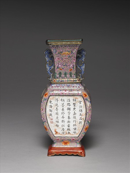 銅胎轎瓶,方口,直長束頸,雙龍形耳,階式肩,微鼓腹,外撇圈足。瓶身底部繪几式底座,帶如意雲形足。器身背面平坦且塗滿白釉,頸部帶孔可供靠牆懸掛。 器身正面施淺色釉,並密佈紅色點紋為地,口沿飾一周如意雲紋,頸部飾轉枝番蓮與蝙蝠,頸底為蕉葉紋,肩飾俯蓮瓣紋。腹部之白地開光內有乾隆御製詩:「官汝稱名品,新瓶製更嘉。隨行供嘯咏,沿路擷芳華。挂處輕車稱,簪來野卉斜。紅塵安得近,香籟度帷紗。」詩末紀年「乾隆御題」,並有「乾」「隆」印文兩枚。開光餘地繪滿各式轉枝花卉。底座內仿木紋釉上書「大清乾隆年製」單行橫向篆款。此種瓶稱作壁瓶,清檔中稱之轎瓶,並盛行於乾隆時期。