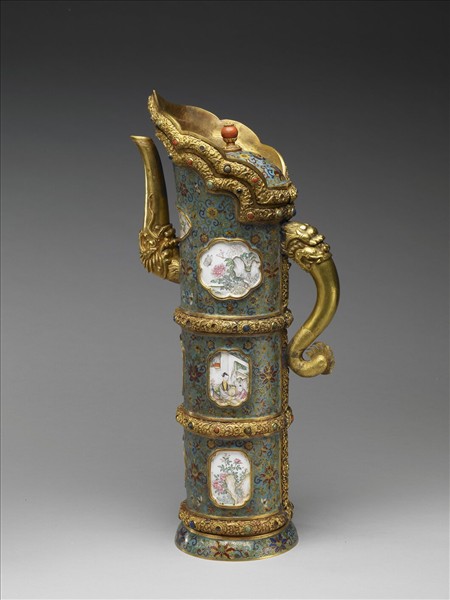 多穆壺為藏人拌、盛酥油茶的器皿,藏語稱為董莫(mdong-mo)或多穆。酥油茶藏語稱恰穌瑪,是將由茶磚熬成的濃茶中,倒入少量的酥油和鹽,有的還加入一些味精和牛奶等佐料,攪拌至水和酥油交融而成,是藏族同胞生活的必需品。此件多穆壺K金胎,類僧帽形壺口,蓮瓣座珊瑚鈕之半球形蓋,壺流自器側的龍口伸出,他側龍口伸出的龍尾為把,筒形器身節分為三,全器以鏨花葉的金屬片緣邊,並於花心位置鑲珊瑚、青金石和松綠石(鑲嵌部份缺失),圈足外撇。器表藍地飾纏枝花為錦,各式開光處繪飾各種花蝶湖石、母子圖、牧羊及鄉村風景等紋飾,圈足上鑲貼長方金屬片,陰刻填黑「大清乾隆年製」一列楷書款。