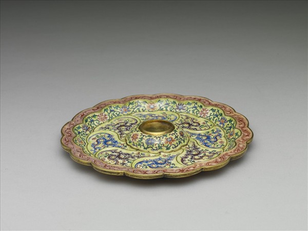 金胎,十六瓣花口,折沿,淺壁,中央有凸起圓形台座,盤面以S形線條隔成八等分。以畫琺瑯為飾,口沿繪粉紅地回首夔龍紋,內壁與台座繪淺綠地轉枝花卉紋,內底繪淺綠地雲紋變形夔龍紋,台座內凹處露胎。外壁繪黃地紅色轉枝花卉紋,外底施淺藍釉,台座處內凹,中心有青花書「乾隆年製」四字雙行明體款。