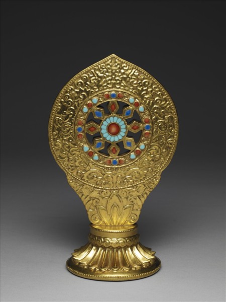 全器為法輪,托以須彌座。法輪中心為鏤空八輪輻形,外以心形火焰飾之。輪的部份鑲飾琺瑯釉點,若仿松石、珊瑚、藍寶石。金色心形火焰為印花卷草紋。須彌座上部為雲紋與三寶蓮葉,足脛以連珠紋飾,外撇的足部模印浮雕細蓮瓣紋,足內金彩書「大清嘉慶年製」三行六字篆款。