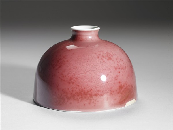 小口微外侈,短頸溜肩,廣腹,形似半圓球,平底凹足。器身施銅紅釉,因受窯爐溫度影響,呈色有深淺之別,類似豇(音同姜)豆色澤,故有豇豆紅釉之說。器腹淺劃三組暗花團螭紋,口沿及器內施白釉,外底有「大清康熙年製」楷體款識。此類小口半圓穹狀的器型一般被稱為「太白尊」,然而清宮檔案舊稱為「花囊」。對照西洋傳教士殷弘緒的書簡,得知是以吹釉法施釉。