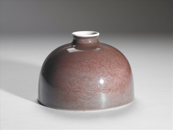 小口微外侈,短頸溜肩,廣腹,形似半圓球,平底凹足。器身施銅紅釉,因受窯爐溫度影響,呈色有深淺之別,類似豇(音同姜)豆色澤,故有豇豆紅釉之說。器腹淺劃三組暗花團螭紋,口沿及器內施白釉,外底有「大清康熙年製」楷體款識。此類小口半圓穹狀的器型一般被稱為「太白尊」,然而清宮檔案舊稱為「花囊」。對照西洋傳教士殷弘緒的書簡,得知是以吹釉法施釉。