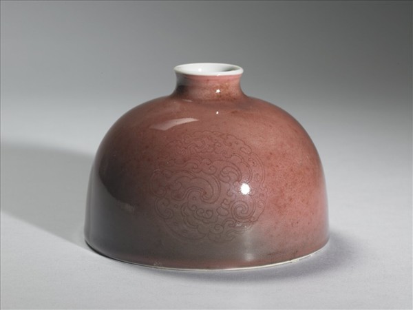 小口微外侈,短頸溜肩,廣腹,形似半圓球,平底凹足。器身施銅紅釉,因受窯爐溫度影響,呈色有深淺之別,類似豇(音同姜)豆色澤,故有豇豆紅釉之說。器腹淺劃三組暗花團螭紋,口沿及器內施白釉,外底有「大清康熙年製」楷體款識。此類小口半圓穹狀的器型一般被稱為「太白尊」,然而清宮檔案舊稱為「花囊」。對照西洋傳教士殷弘緒的書簡,得知是以吹釉法施釉。