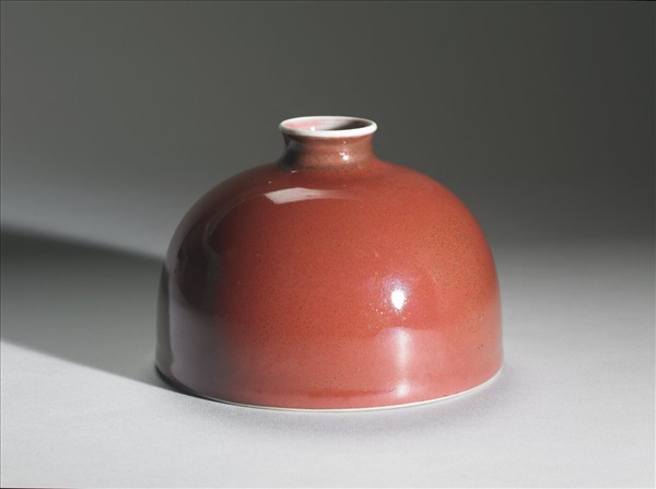 小口微外侈,短頸溜肩,廣腹,形似半圓球,平底凹足。器身施銅紅釉,因受窯爐溫度影響,呈色有深淺之別,類似豇(音同姜)豆色澤,故有豇豆紅釉之說。器腹淺劃三組暗花團螭紋,口沿及器內施白釉,外底有「大清康熙年製」楷體款識。此類小口半圓穹狀的器型一般被稱為「太白尊」,然而清宮檔案舊稱為「花囊」。對照西洋傳教士殷弘緒的書簡,得知是以吹釉法施釉。