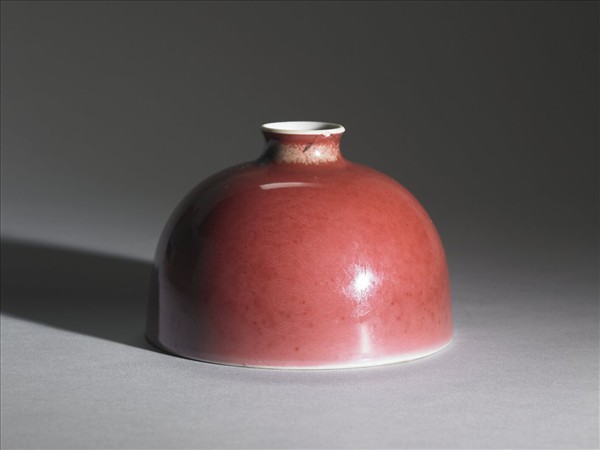 小口微外侈,短頸溜肩,廣腹,形似半圓球,平底凹足。器身施銅紅釉,因受窯爐溫度影響,呈色有深淺之別,類似豇(音同姜)豆色澤,故有豇豆紅釉之說。器腹淺劃三組暗花團螭紋,口沿及器內施白釉,外底有「大清康熙年製」楷體款識。此類小口半圓穹狀的器型一般被稱為「太白尊」,然而清宮檔案舊稱為「花囊」。對照西洋傳教士殷弘緒的書簡,得知是以吹釉法施釉。