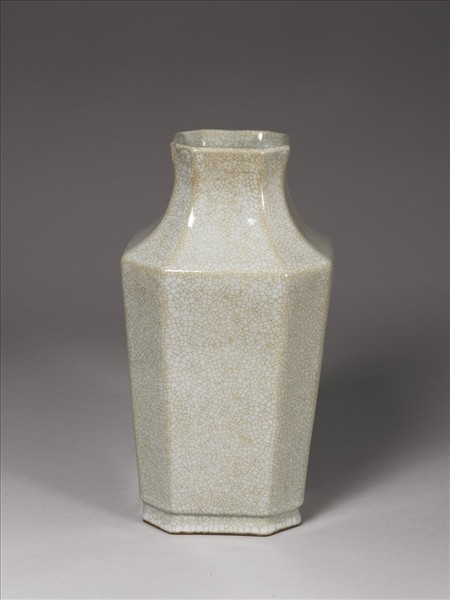 直口微撇,短頸,斜肩,直腹,圈足,全器作八方形。通體施灰青釉,釉面滿佈細碎褐色開片紋。圈足露胎,塗棕色護胎汁,底心書「大清乾隆年製」青花篆款。