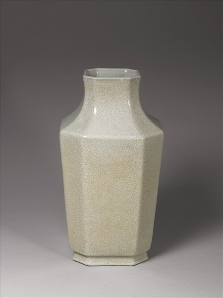 直口微撇,短頸,斜肩,直腹,圈足,全器作八方形。通體施灰青釉,釉面滿佈細碎褐色開片紋。圈足露胎,塗棕色護胎汁,底心書「大清乾隆年製」青花篆款。