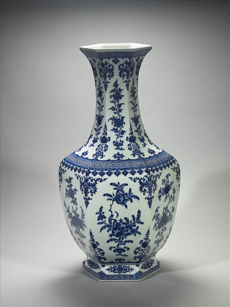 器作六方瓶形,口緣一周回紋,頸部畫纏枝番蓮。肩頸相間處一周「卍」字紋,腹作六面,各畫折枝番蓮、石榴、桃實與佛手等紋飾。足部飾花卉圖案與回紋。底青花書「大清乾隆年製」六字篆款。