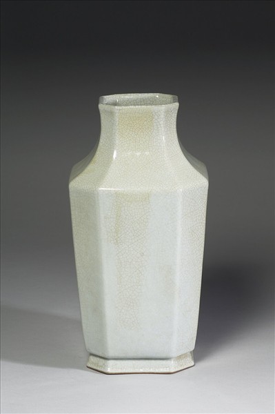 瓶,全器作八邊形,侈口寬敞,短頸,斜肩,長腹下斂,圈足。通體施青瓷釉,灰青色帶米黃,密佈淺色開片紋。圈足露胎,塗棕色護胎汁,底心書「大清乾隆年製」青花篆款。
