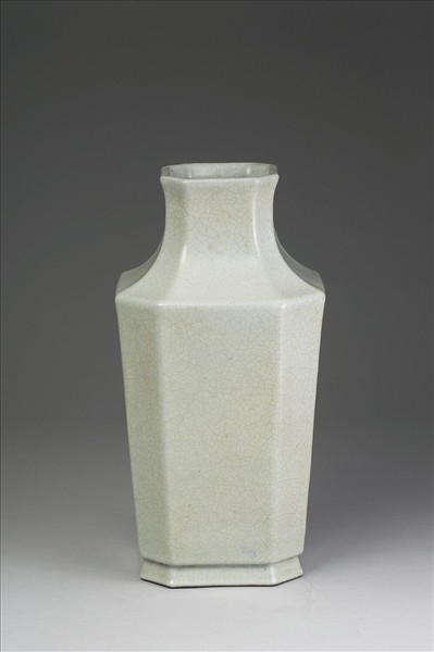 瓶,全器作八邊形,侈口寬敞,短頸,斜肩,長腹下斂,圈足。通體施青瓷釉,灰青色帶米黃,密佈淺色開片紋。圈足露胎,塗棕色護胎汁,底心書「大清乾隆年製」青花篆款。