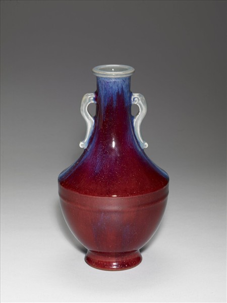 小唇口,長頸,雙耳,折肩,腹部下斂,撇足。通體施鈞紅釉,呈紅、靛、紫、月白等多色深淺混雜流動窯變釉,口內與龍形板耳則多作淺月白藍色。器底施月白釉,底心印「大清乾隆年製」六字三行篆款。圈足露胎,塗赭色汁。仿鈞窯變釉為雍正時期出現的新品種,係仿鈞釉色繁衍而來,採多次施釉,燒成過程中,不同金屬元素自然結合。