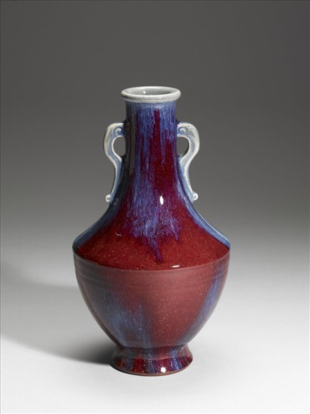 小唇口,長頸,雙耳,折肩,腹部下斂,撇足。通體施鈞紅釉,呈紅、靛、紫、月白等多色深淺混雜流動窯變釉,口內與龍形板耳則多作淺月白藍色。器底施月白釉,底心印「大清乾隆年製」六字三行篆款。圈足露胎,塗赭色汁。仿鈞窯變釉為雍正時出現的新品種,係仿鈞釉色繁衍而來,採多次施釉,燒成過程中,不同金屬元素自然結合。所產生的流動窯變釉色,一般偏藍者,稱「火焰青」;偏紅者,稱「火焰紅」。