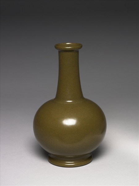唇口,直長頸,球腹,圈足外撇。通體施茶葉末釉,光素無紋飾。圈足露胎塗褐色汁一圈,外底茶葉末釉地模印「大清乾隆年製」三行六字篆款。