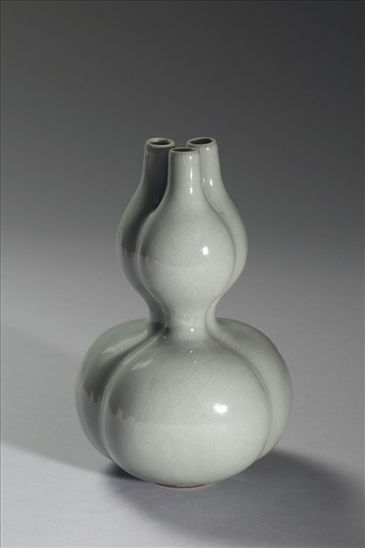 三連葫蘆瓶,器式為三葫蘆作「品」字排列併接而成,三瓣形足。全器施罩冬青釉,釉色勻淨瑩潤,圈足露胎,塗褐色汁,足內青釉地「大清乾隆年製」三行六字鈷藍篆款。