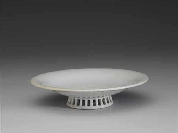 盤,敞口,淺弧壁, 平底,圈足,圈足壁等距挖孔,使呈柵欄狀。全器施白釉,釉色潔白勻潤,以印花為飾,盤心有一寶相花,內外壁各分列三朵番蓮花紋,內口沿有一道邊棱。圈足底緣露胎無釉,塗褐色護胎汁。
