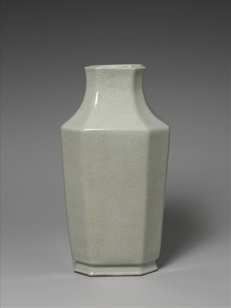 瓶,全器作八邊形,侈口寬敞,短頸,斜肩,長腹下斂,圈足。通體施青釉,密佈淺色開片紋。圈足露胎,塗棕色護胎汁,底心以青花書「大清乾隆年製」六字三行篆款。