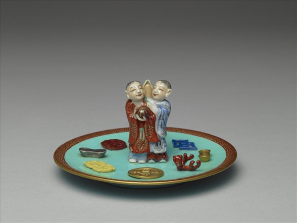 此粉彩香插主要部分為一淺碟,碟心立二仙人,其四周貼飾道教八寶一古錢、雙錢、銀錠、單錢、犀角、方勝、金錠、珊瑚,共八樣。雖然是道教八寶,然而八樣物件與元明的道教八寶有很大的差異。譬如說,銅錢就出現三次,有造型及單、雙的不同。又如銀錠、金錠同時出現,再加上昂貴的珊瑚和犀角,整件香插充滿了財喜之氣。古錢上有「天下太平」的文字。碟子的內外塗湖綠釉,碟沿飾珊瑚紅地描金回紋一周。圈足底緣露胎呈白色,器底有描紅「大清乾隆年製」六字三行篆款。
