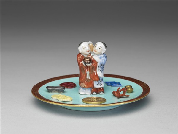 此粉彩香插主要部分為一淺碟,碟心立二仙人,其四周貼飾道教八寶一古錢、雙錢、銀錠、單錢、犀角、方勝、金錠、珊瑚,共八樣。雖然是道教八寶,然而八樣物件與元明的道教八寶有很大的差異。譬如說,銅錢就出現三次,有造型及單、雙的不同。又如銀錠、金錠同時出現,再加上昂貴的珊瑚和犀角,整件香插充滿了財喜之氣。古錢上有「天下太平」的文字。碟子的內外塗湖綠釉,碟沿飾珊瑚紅地描金回紋一周。圈足底緣露胎呈白色,器底有描紅「大清乾隆年製」六字三行篆款。