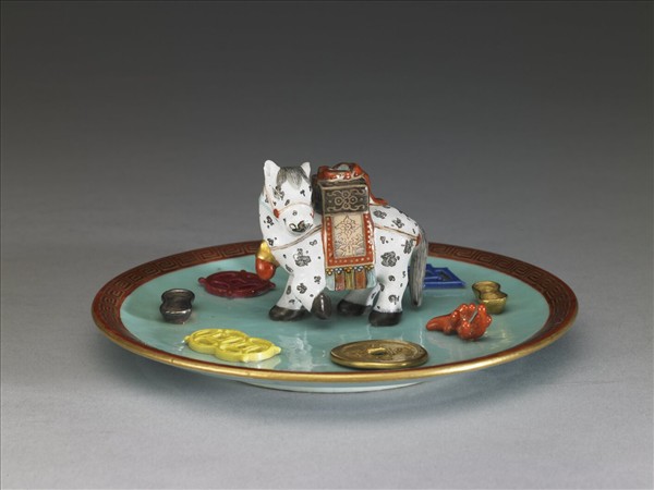 此粉彩香插主要部分為一淺碟,碟心立一白馬,其四周貼飾道教八寶一古錢、雙錢、銀錠、單錢、犀角、方勝、金錠、珊瑚,共八樣。雖然是道教八寶,然而八樣物件與元明的道教八寶有很大的差異。譬如說,銅錢就出現三次,有造型及單、雙的不同。又如銀錠、金錠同時出現,再加上昂貴的珊瑚和犀角,整件香插充滿了財喜之氣。馬背裝飾了寶盒。古錢上有「天下太平」的文字。碟子內外壁塗湖綠釉,碟沿飾珊瑚紅地描金回紋一周。圈足底緣露胎塗淺褐色護胎汁,器底書有「大清乾隆年製」鐵紅篆款。