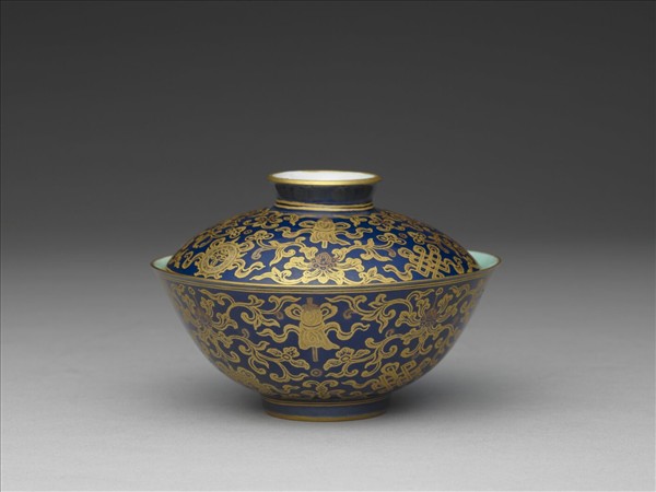 蓋碗,敞口,深壁,圈足,帶圈足鈕笠形蓋。外壁施霽青釉,以金彩描繪紋飾,蓋面及外壁皆繪佛教八寶,隙地繪番蓮花葉紋,蓋與碗之口、足緣皆塗金彩,並有兩道弦紋;內壁及圈足內皆施湖綠釉,蓋鈕及圈足外底各以青花書「大清乾隆年製」六字三行篆款。