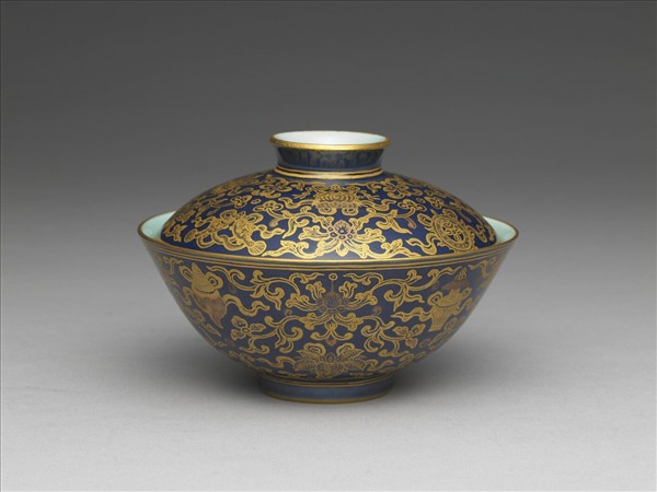 蓋碗,敞口,深壁,圈足,帶圈足鈕笠形蓋。外壁施霽青釉,以金彩描繪紋飾,蓋面及外壁皆繪佛教八寶,隙地繪番蓮花葉紋,蓋與碗之口、足緣皆塗金彩,並有兩道弦紋;內壁及圈足內皆施湖綠釉,蓋鈕及圈足外底各以青花書「大清乾隆年製」六字三行篆款。