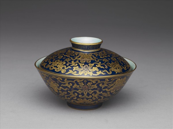 蓋碗,敞口,深壁,圈足,帶圈足鈕笠形蓋。外壁施霽青釉,以金彩描繪紋飾,蓋面及外壁皆繪佛教八寶,隙地繪番蓮花葉紋,蓋與碗之口、足緣皆塗金彩,並有兩道弦紋;內壁及圈足內皆施湖綠釉,蓋鈕及圈足外底各以青花書「大清乾隆年製」六字三行篆款。