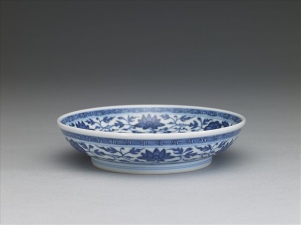 盤,侈口,弧壁,圈足。白地青花,內口沿飾卷草紋一圈,內壁畫轉枝花卉,碗心繪纏枝花卉紋。外口緣有回紋一圈,外壁繪飾轉枝四季花卉紋。圈足底緣露胎,呈白色,外底中心以青花書「大清乾隆年製」三行六字篆款。