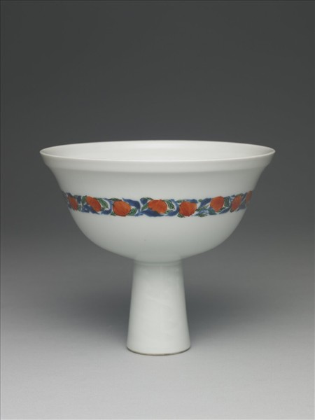 靶碗,微撇口,深弧壁,高足。口緣有邊稜,以五彩為飾,外壁中央繪一圈桃實桃葉,內底有一圓形開光,內繪湖石、靈芝、茶樹,樹上有一對太平鳥,襯以祥雲,有「太平春喜」之意。