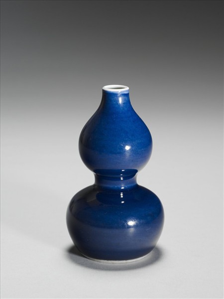 葫蘆瓶,圓口,短頸,圓腹,束腰,平底,凹足。外壁施藍釉外底以青花書「大明宣德年製」六字雙行楷款,外加雙圈。