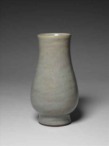 敞口,微束頸,垂腹,高圈足。全器內外壁施官釉至足際,口沿呈一道淺褐色邊。足邊修釉齊整。足圈露胎,圈足內底亦帶釉。釉面佈滿大小不一之深色開片。