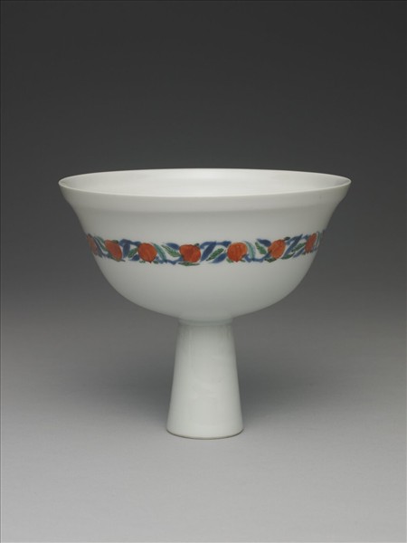 敞口,深弧壁,高足外撇。全器內外罩施白釉,外壁中央繪飾一周桃實與葉紋,鮮果與綠葉相互輝映,顏色分明。碗心帶一開光,內繪一對鳥兒於枝頭互望,周遭佈滿奇石、靈芝與花卉。靶碗之高足可當把手,而游牧民族多在騎馬時將此類器皿隨身攜帶,當作飲用器皿。