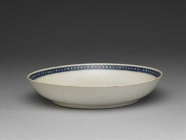 敞口,弧壁,圈足。全盤內外壁與圈足內底皆施米白色釉,足圈露胎。盤內近口沿處帶一圈深藍色幾何紋,內壁以貼花技法飾竹子與梅花,右上方有雙燕飛舞。