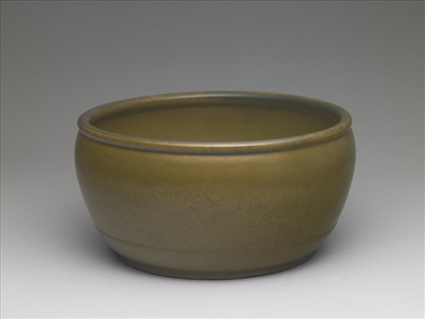 唇口,口緣下方一圈深凹,深弧壁下斂,底內凹為足。整器光素無紋,內外施茶葉末釉,呈色濃綠透黃。底外露胎一圈,呈淺紅褐。底外中心釉下模印「大清雍正年製」三行六字篆款。所謂茶葉末釉,是一種高溫色釉,其呈色往往綠黃交融,呈見一種較為細緻而不搶眼的乳湯狀呈色,這與唐英《陶成紀事碑記》中對「廠官釉」的描述有:「鱔魚黃」、「蛇皮綠」等描述似可對合,所以研究者也將這種釉名為「廠官釉」。然對照釉色的表現,「茶葉末」一詞顯然更能貼切形容。故亦多見以「茶葉末」名此類釉器者。