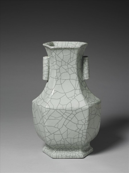 六方形侈口,全器一體作六棱形,直頸,雙貫耳,折肩,碩腹下斂,六方形圈足。整器施青瓷釉,釉色瑩潤偏青白,滿布鐵線紋。足緣露胎一圈,塗褐色汁,應是模仿官窯鐵足的效果。足內滿釉青花書「大清乾隆年製」三行六字篆款。